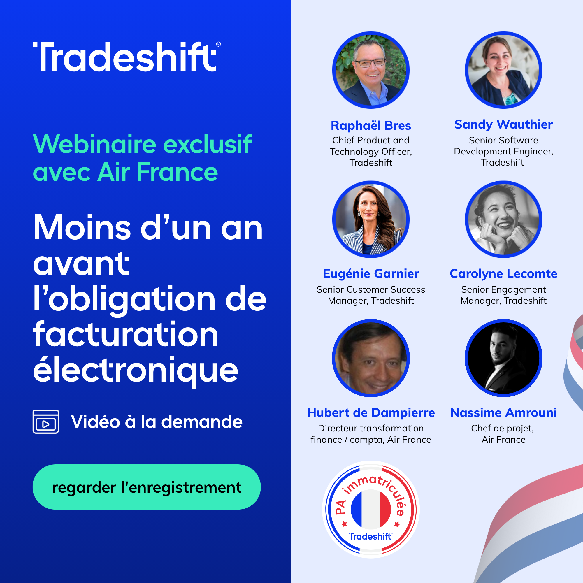 Prêt à vous engager en toute confiance sur la voie de la conformité ? Regardez un webinaire exclusif, au cours duquel nos experts en conformité et Air France partageront leur expérience de la mise en œuvre de Tradeshift comme solution de gestion des achats. Vous apprendrez comment préparer votre organisation à la transition, comprendre les dernières mises à jour techniques et explorer comment positionner votre organisation pour une réussite à long terme au-delà de 2026.